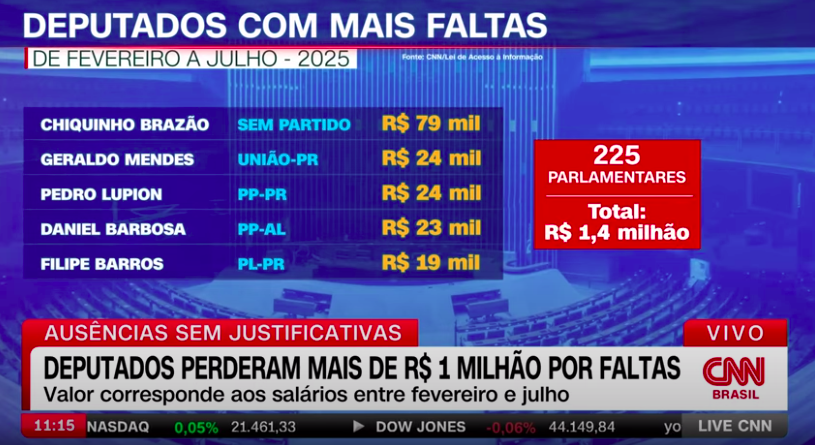 O levantamento da CNN revela que quase metade dos parlamentares em exercÃcio já faltou ao menos uma vez sem justificativa no perÃodo analisado. Entre os que mais acumularam ausências está Chiquinho Brasão (sem partido), que teve 33 faltas antes de perder o mandato e ser preso, acusado de ser o mandante do assassinato da vereadora Marielle Franco — ele teve R$ 79 mil descontados
